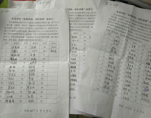 最后,各班同学在各班班长的组织下签署了拒绝网络贷款承诺书。